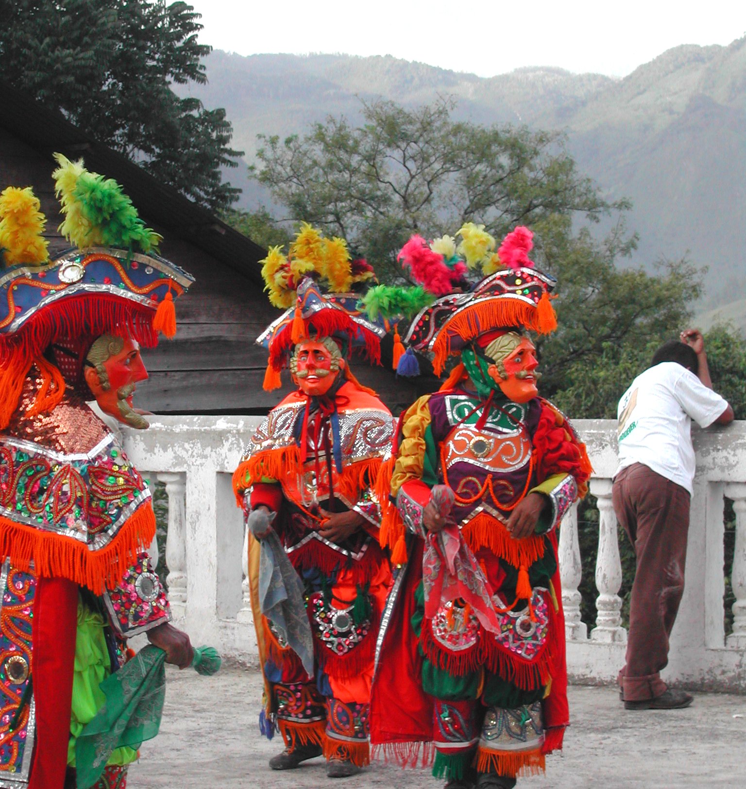 High in a mountain village in Guatemala, the people still practice their traditional dancing and music adorned in costumes. The dances narrate the story of colonization and the fall of the Mayan empire. The masks you can see above represent the Spaniards during the colonization of the 1400s and beyond. Through the dancing, they unraveled a story of torture and massacre on the people, land, flora, and fauna. The brightly colored clothing is very typical of Guatemala past and present. And in this village the only language spoken was Quiche, a language with ancient Mayan roots. (August 2003)