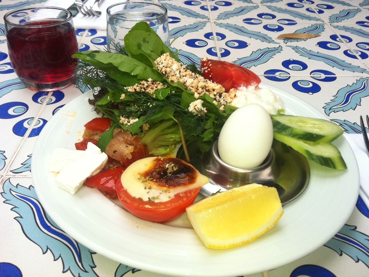 Then there was a delightful foodie experience this morning. Breakfast. When I got back to the hotel breakfast was just about ready. It is buffet style – as the Turks love buffets! I’ve befriended the chef at the hotel restaurant and he has graciously educated me on Turkish cuisine, how the dishes are cooked and which spices to use for what, etc. This morning the buffet included bowels of fresh herbs and a variety of greens that looked so fresh I couldn’t resist – red leaf lettuce, rocket, lemon arugula, fresh dill, mint & parsley. It’s a salad kind of morning! And there I created a masterpiece. A tower of vibrant leafy greens topped with aromatic spices, crumbled feta, and fresh lemon squeezed lemon. All this paired with a hard boiled egg, fresh cucumber slices, a dollop of natural yogurt, and fresh tomatoes of course. My whole body felt good after this clean and hearty breakfast. I want to start having salad breakfasts a couple days a week. If you haven’t tried a salad breakfast like this before, it’s not too late to give it a try. And with summer just around the corner, tis the season to grow all these delicious greens and fresh veggies. Add a little protein and you’ll have an energy packed day. A lot of people wonder where I get my energy from, well I think God blessed me with a little extra energy but I also try to feed that energy with things like fresh greens and clean foods. Now I’m not always fresh and clean like this but most of the time it works out. Now if this breakfast, doesn’t make your mouth water I don’t know what to say. Bon Apettit!