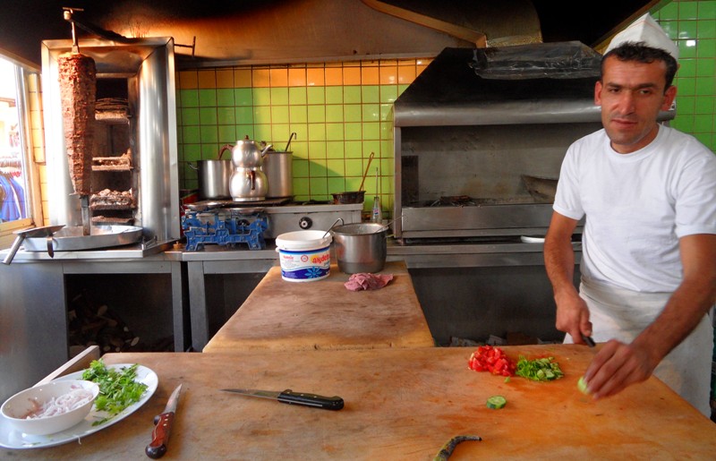 Now onto today’s foodie experience. After a few of hours weaving around the sunny streets of Antalya I found an area where there were several traditional kebab restaurants. The doner kabab meat rotates on a large vertical cooking device, it continually cooks over low heat that brings to life the aromatics of the spices laced within the meat & natural juices. This seemed like the perfect opportunity to give Turkish meat a try – and I am glad I did. All of the restaurants in this area were filled only with local Turks, so I put my bet that this would be one of the best places. I took a seat at a table outside, dining al fresco is the best way to go in Antalya. The waiter kindly gave me the menu, all in Turkish yet again! But this time the Turkish names & descriptions were accompanied by photographs of each dish. This was most helpful. I gave my broken Turkish a whirl and placed my order with the waiter. Here you have to order using portion sizes in grams. Given how large servings here are, I went for the small portion (100 grams). And out it came 20 minutes later – a heaping plate of what I call Turkish Iskender Delight. Thin slices of the doner kebab meat cooked in an aromatic sauce of tomatoes, onions, and spices. Served up on a bed of cubed pita bread, all the saucy doner kebab meat drenched the pita cubes with its delicious juice. It was served with four thick slices of sweet tomatoes, a big spoonful of natural plain yogurt, and one fresh hot pepper. The meat was so flavorful and juicy. The yogurt gave the dish a cooling sensation to balance the crisp hot pepper pieces I ate with each bite of donor kebab meat. I was also divine – like most all food in Turkey so far. After I finished my meal, I went inside and spoke with the chef for a few minutes. He was busy chopping up fresh herbs and cucumber. I do believe this meal of Turkish Iskender Delight was cooked with love!